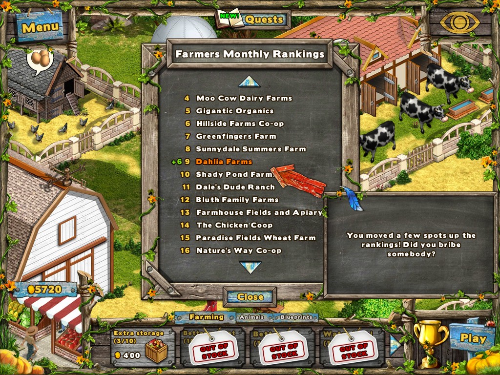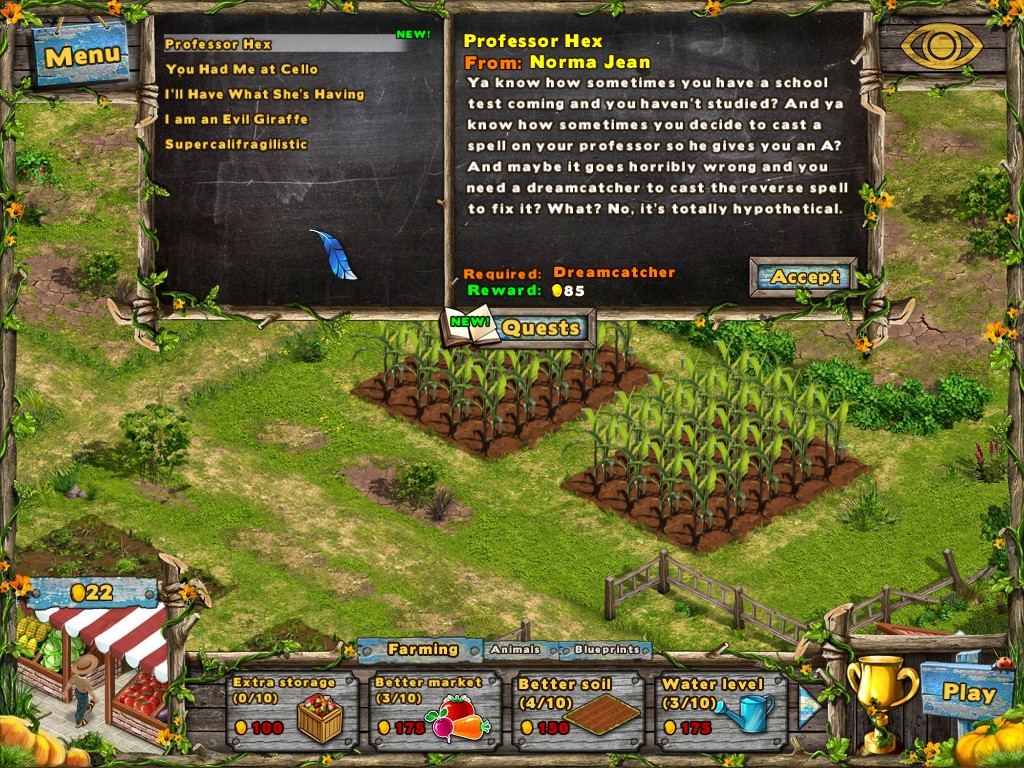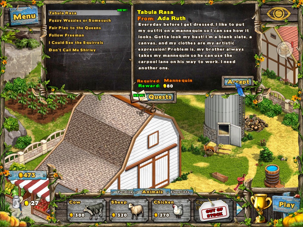Let's get farming in this unique Hidden Object Farming Sim hybrid! Grow crops and run the farmer's market! Hidden objects are random so scenes are always new! Complete quests, build upgrades, and harvest the perfect crop. Even eggs, milk, and wool!