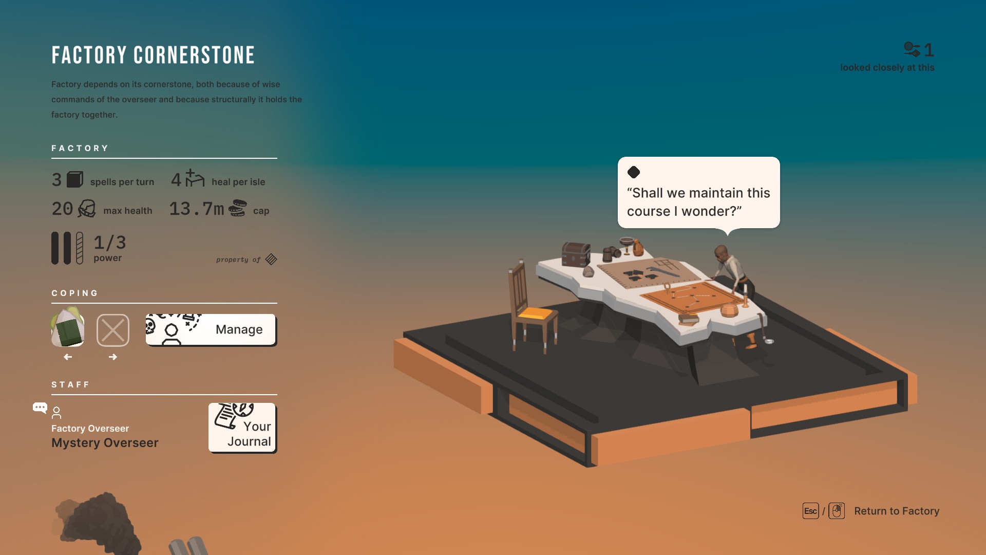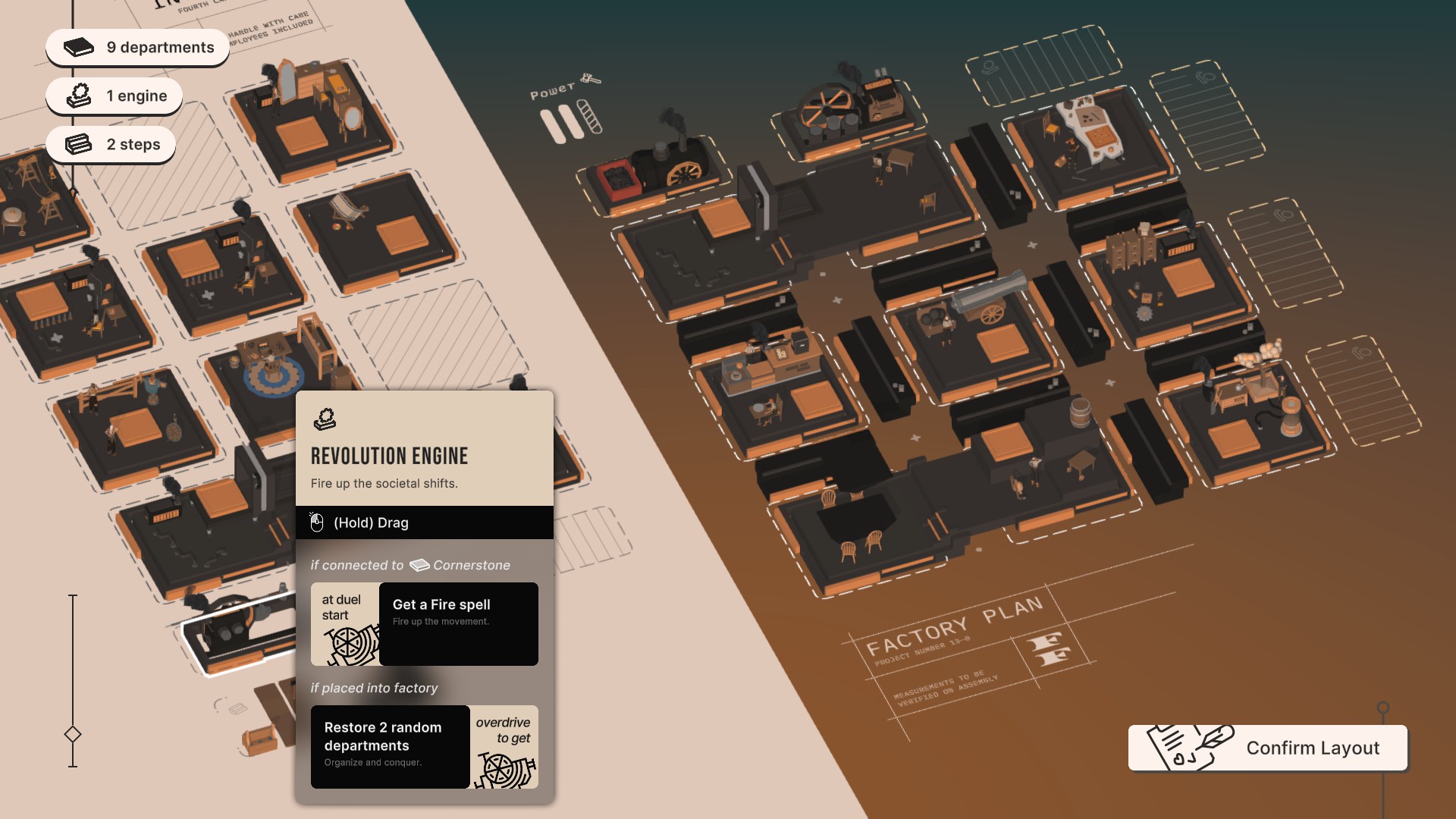 Fay’s Factory is a story-based RPG at heart, with deckbuilding elements on top. Manufacture magic and fight duels. Go on hand-crafted adventures. Investigate, argue and lie. Become a great middle manager or a decent human being.
