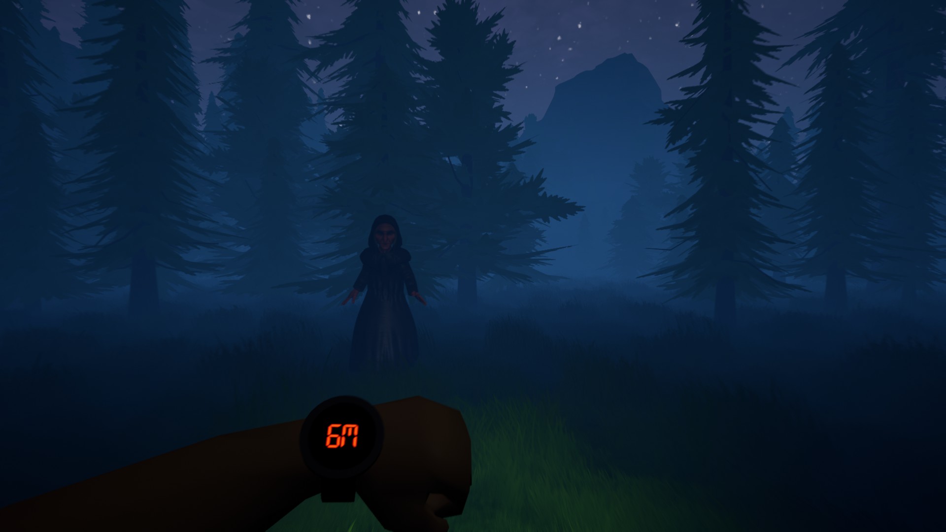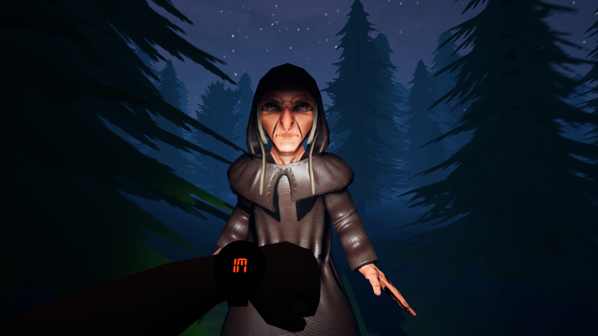 First person horror game, you have a special watch in your hand which shows the distance to the noita. Find a bottle which noita needs and bring it back. Use gun, collect mushrooms and avoid noita to find the bottle.