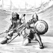 Les gladiateurs sont dans l'arène et le combat est lancé.