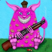 Fuzzy pink creature of fluff, hench-thing, occasional poltergeist, cookie tree, pillow stand-in, Vincent obsesser, family pet, swervy pinkster, and honorary dude; with cotton candy tasting fur, watermelon flavor, a pump action shotgun (for zombies), muffin-stuffin', and big teeth.