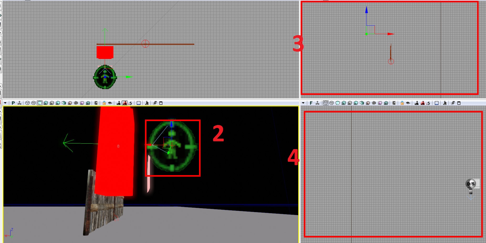 In case your ROCoverLink is floating in the air, I will show you how to align it properly with floor. You can select the ROCoverLink and press the End key. Sometimes that doesn't work very well. The next best technique is to select (3) it. Then hold down right mouse button over either the (3) side viewport or the (4) front view port until you see a hand and that shows that you are in dragging mode. Just release it and you will see whichever viewport you chose will be highlighted yellow. Now look at the 3D viewport and use the arrow keys to move the ROCoverLink up and down and align it.