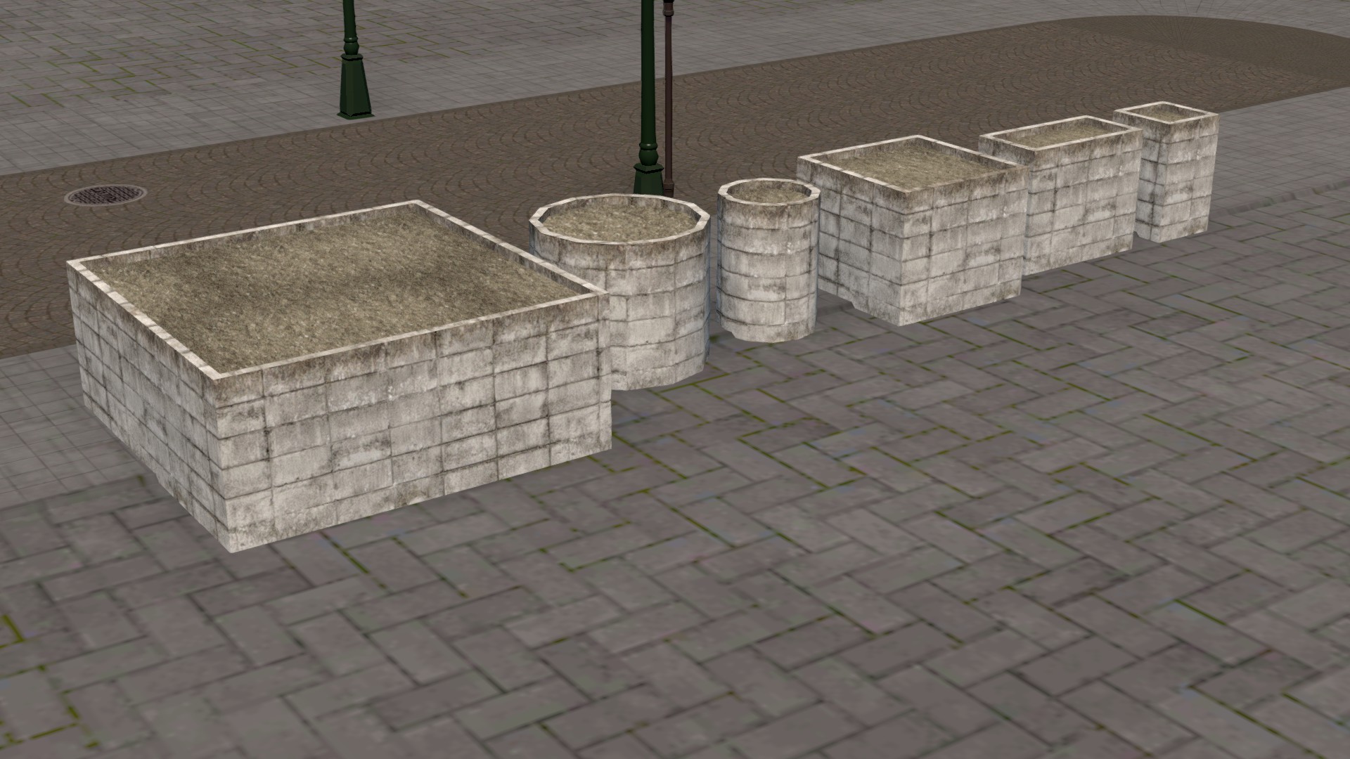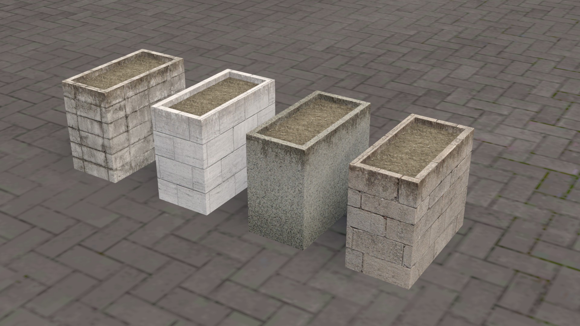 Set of 24 planters. Big and small cilinders, big, medium and small squares and rectangle. Each one with 4 different texture variations.