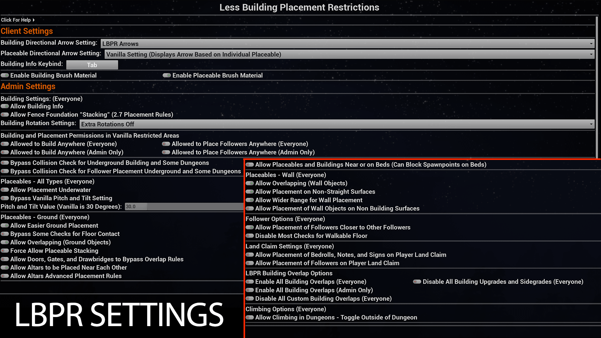 The Less Building Placement Restrictions (LBPR) mod is intended to make building and placement easier. It offers a wide, and ever growing list of features that can make your building dreams come true. The mod has been carefully crafted over the years to offer an ever growing library of features for both admins and players.