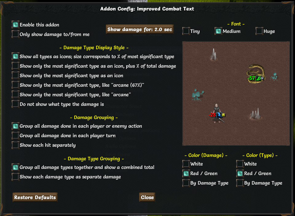 - Various font coloring options (color by major damage type, use the default red / green, etc.)