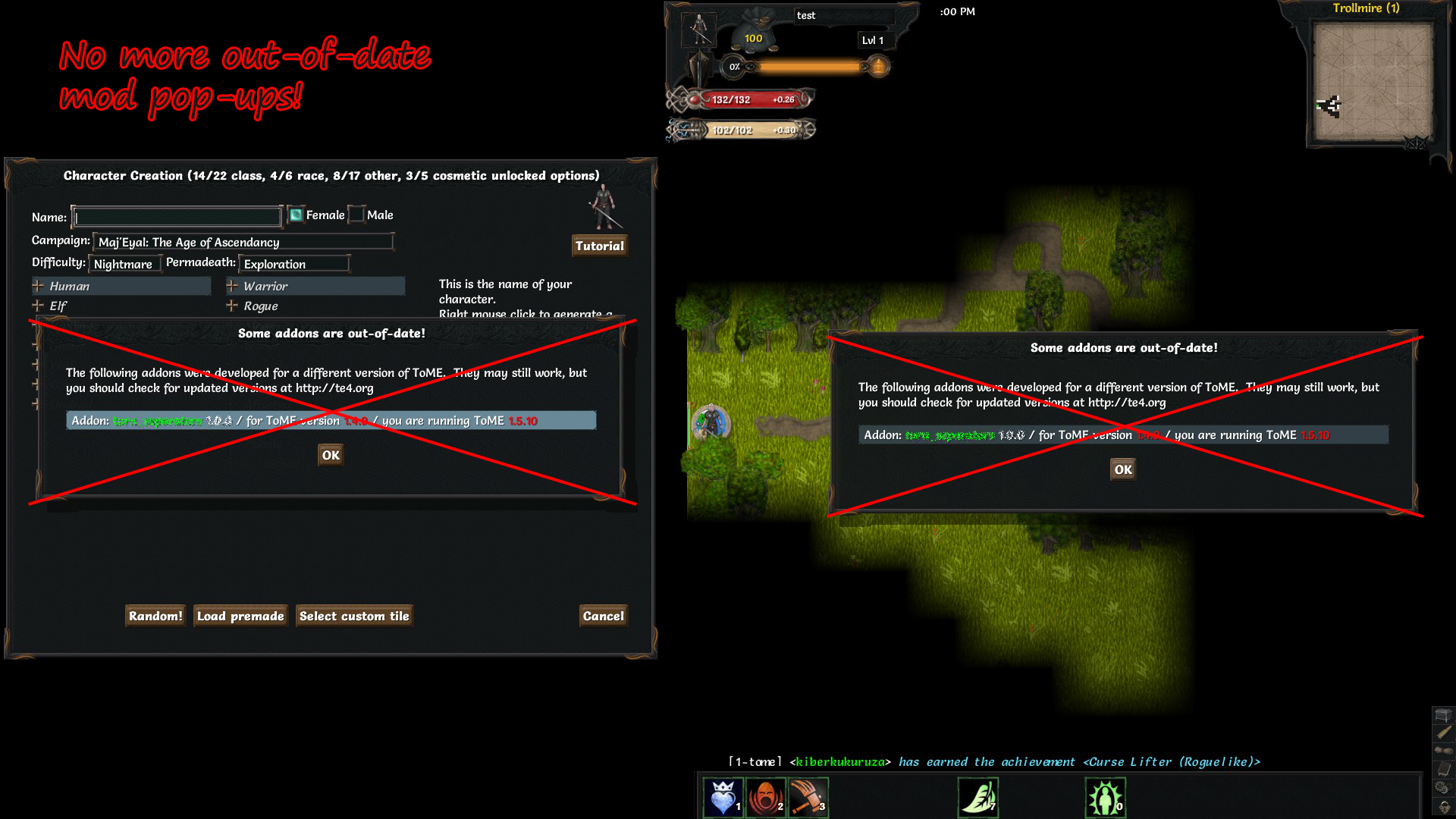 • From site: Delete the file named '%mod_name%.teaa' from C:\Program Files\Steam\steamapps\common\TalesMajEyal\game\addons