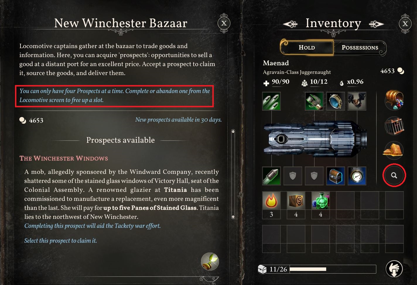 There’s a very rare bug where prospects that you’ve completed can go into negative figures. When this happens, the prospect is removed from the Bazaar interface and the Hold panel, but it still exists in the save file data. When you have three prospects and try to claim a fourth in this situation, you’re unable to do so. The Bazaar UI will insist you have four active prospects and will instruct you to abandon one to free up a slot.