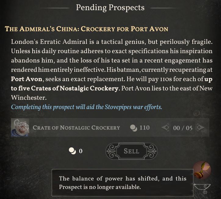 Some prospects have requirements just like branches on storylets. You may be eligible for a prospect when you claim it at a hub port, but if your circumstances change before you can deliver the goods, then you will be prevented from handing the prospect in. If you no longer meet the prospect’s requirements, the quality requirement icon below it will be greyed out. Mousing over it will give further details.