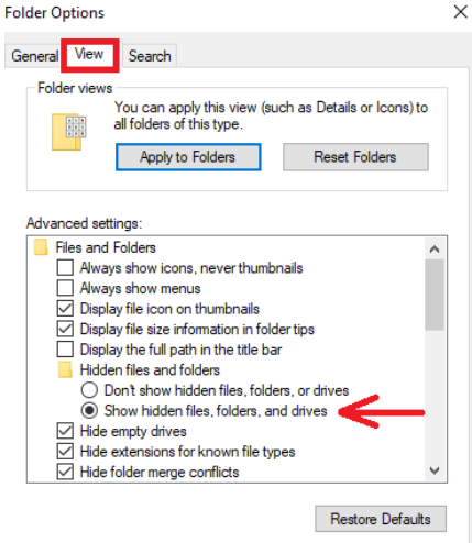 4. Under Files and Folders, you'll see the Hidden files and folders directory and two radials - make sure the Show hidden files, folders and drives radial is selected