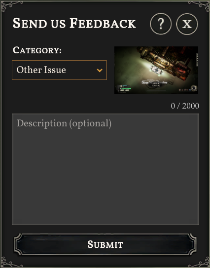 Sunless Skies has an in-game feedback and bug reporting tool which is accessible by pressing F8, or via the Give Feedback button on the Main Menu (press Esc or click the Cog icon on the HUD).