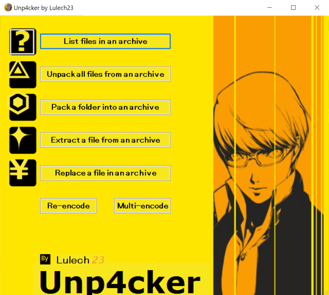 **Now with GUI!** Unp4cker is a *.pac archive editor designed to view and extract P4G cutscenes for modification. It can also repackage them back into the game! Replace the Golden intro with the PS2 classic, re-encode to fix stuttering, and more!
