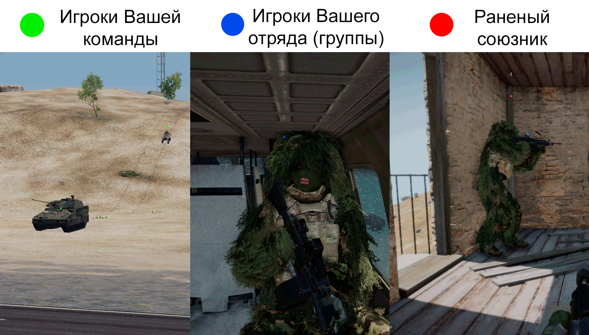Игроки, техника и авиация противника не имеют никаких маркеров. Также маркеры отсутствуют на союзных БПЛА. Принадлежность БПЛА к стороне можно проверить на карте.