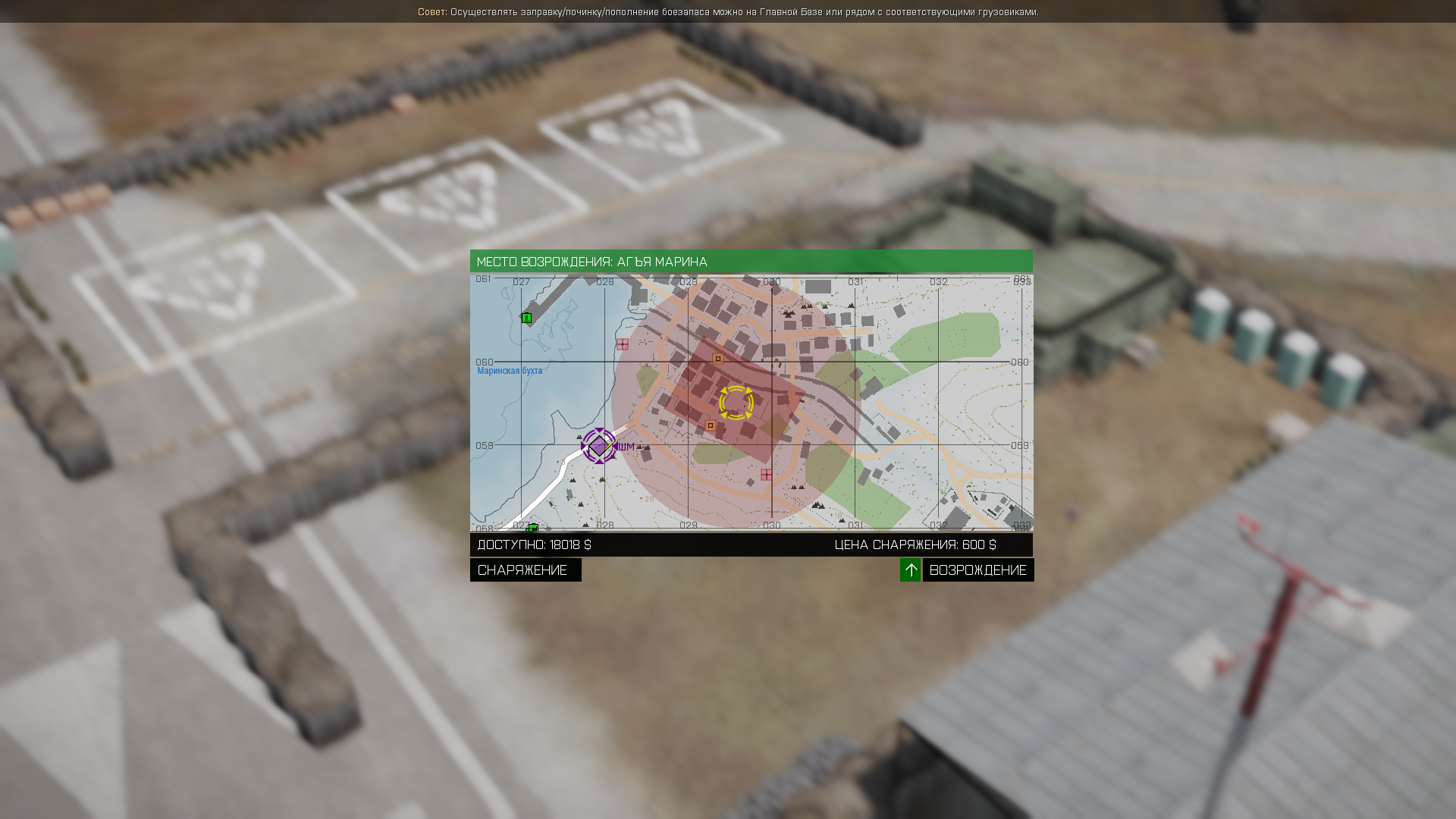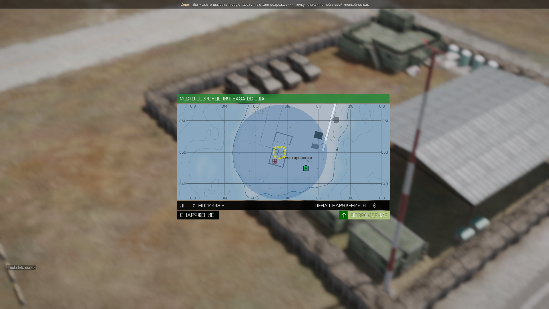 Теперь вернёмся к возрождению. Выбрав в качестве точки респауна Базу, нажимаем кнопку "Возрождение":