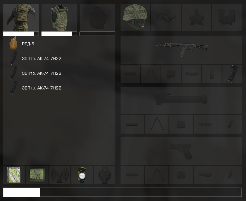 — выбрать нужные элементы вооружения и экипировки;