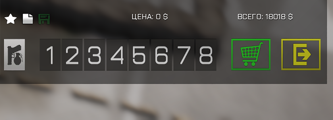 В нижней правой части экрана расположены кнопки взаимодействия. Вы можете выбрать один из готовых наборов вооружения, нажав на соответствующий номер слота. Также Вы можете создать и сохранить свой набор вооружения.