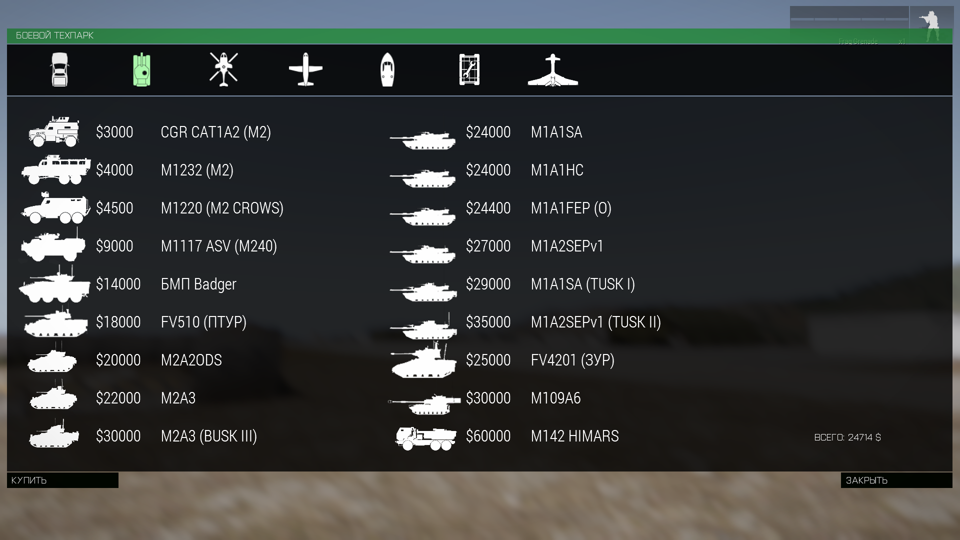 на КШМ .Командно-штабная машина является мобильной базой. Возрождение возможно в случаях, когда КШМ не двигается, не находится в воде и не уничтожена. Обращаем Ваше внимание на то, что КШМ обеих фракций не способны плавать! Также у игроков, находящихся возле дружественной КШМ, имеется возможность покупать и продавать оружие и снаряжение, делать перевязку, а также купить квадроцикл (Стоимость - 150$):