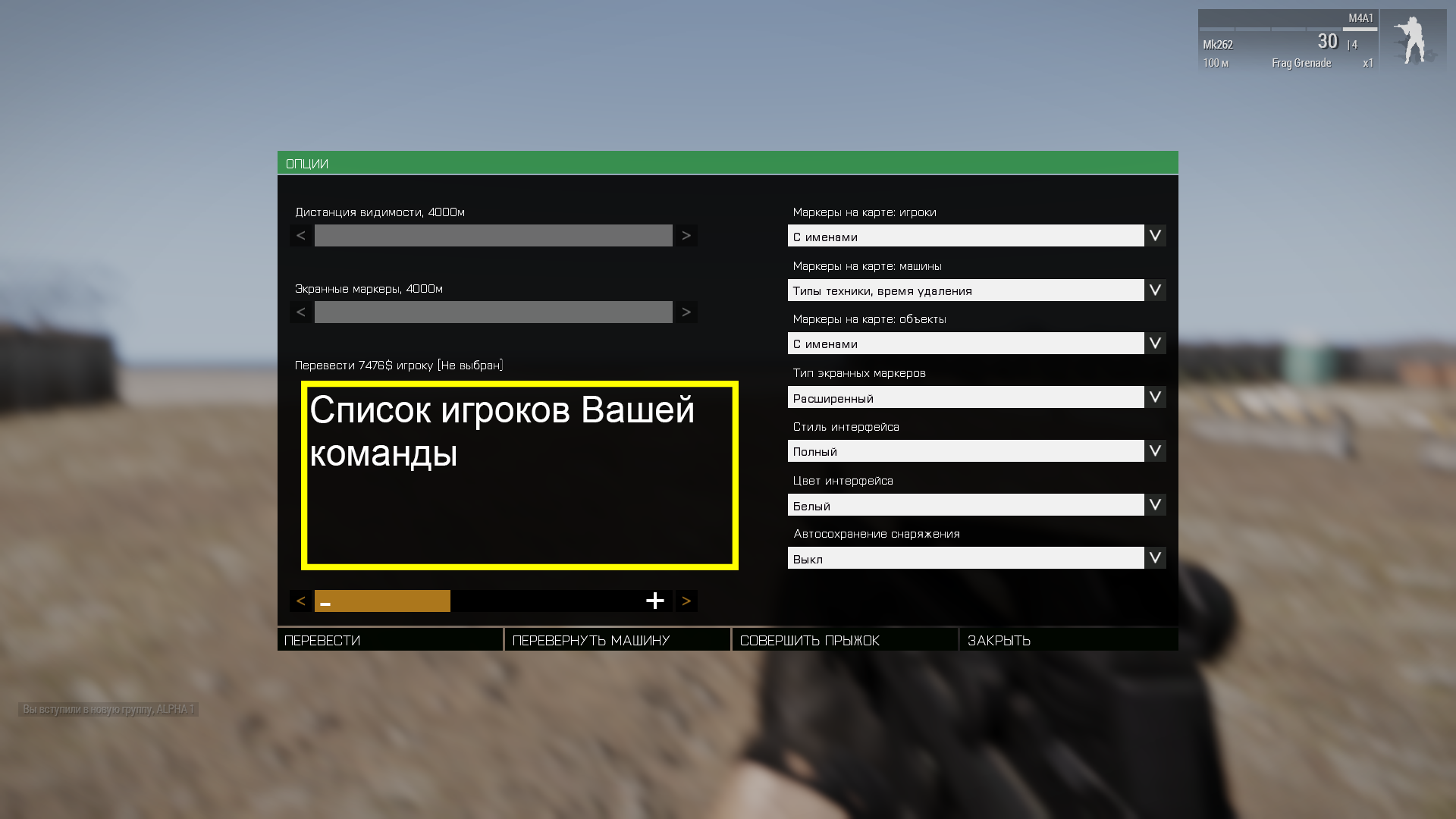 "Главное меню" позволяет Вам настроить интерфейс, а также перечислить частично или полностью свои денежные средства любому игроку Вашей команды:
