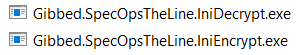 To make them accessible, you will need to use these programs extracted from the .zip folder. All you need to do is drag an .ini file onto Gibbed.SpecOpsTheLine.IniDecrypt.exe, and it will be readable and editable.