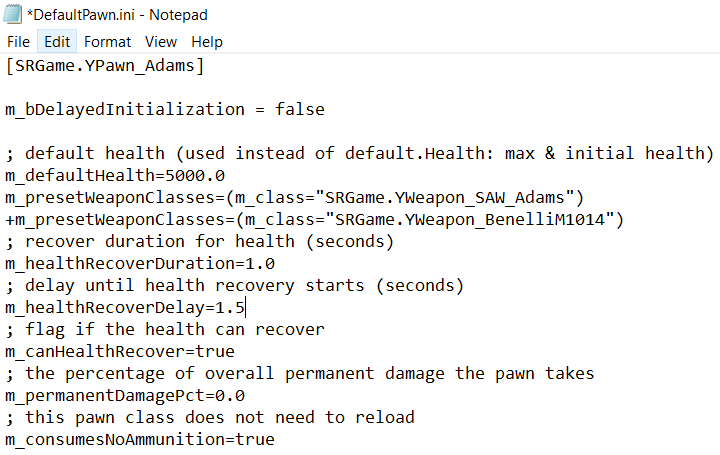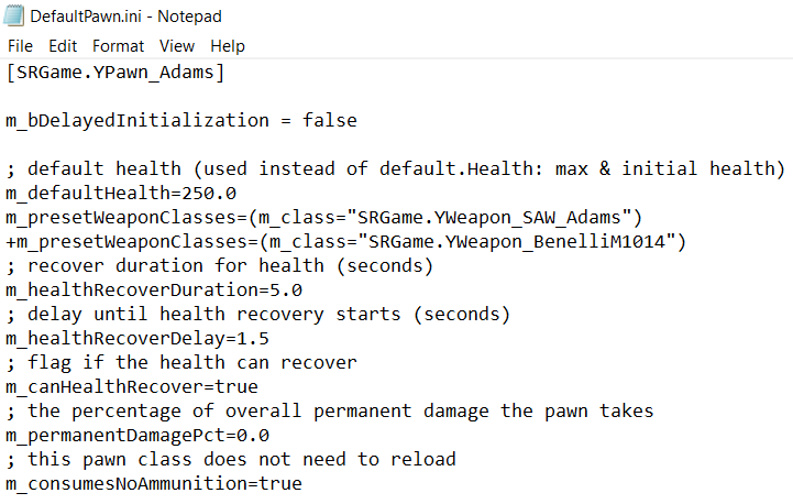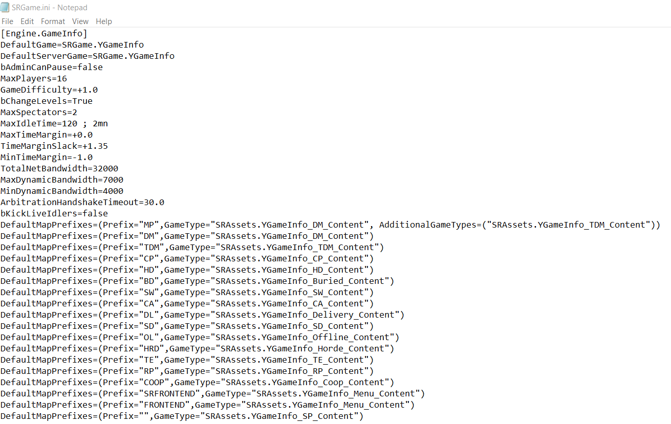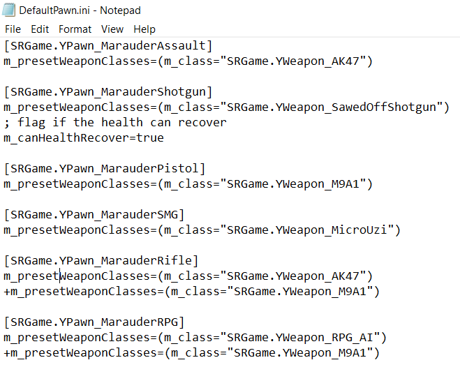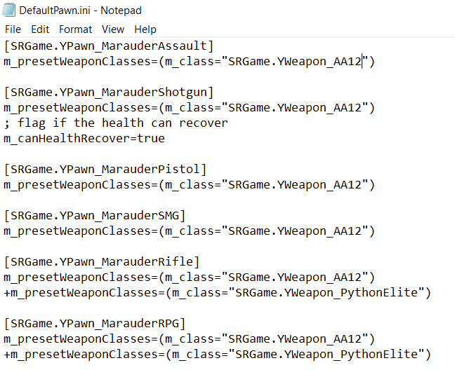 The weapon list is included in the next section of the guide. For now, replace all primary weapons with "SRGame.YWeapon_AA12" and all secondary weapons with "SRGame.YWeapon_PythonElite". When you're done, the file should look something like this...