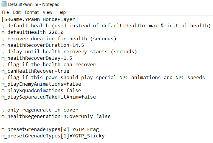 You can change the health values for Walker, his allies, and enemies in the DefaultPawn.ini file. You can also modify the health regeneration rate for characters along with other traits.