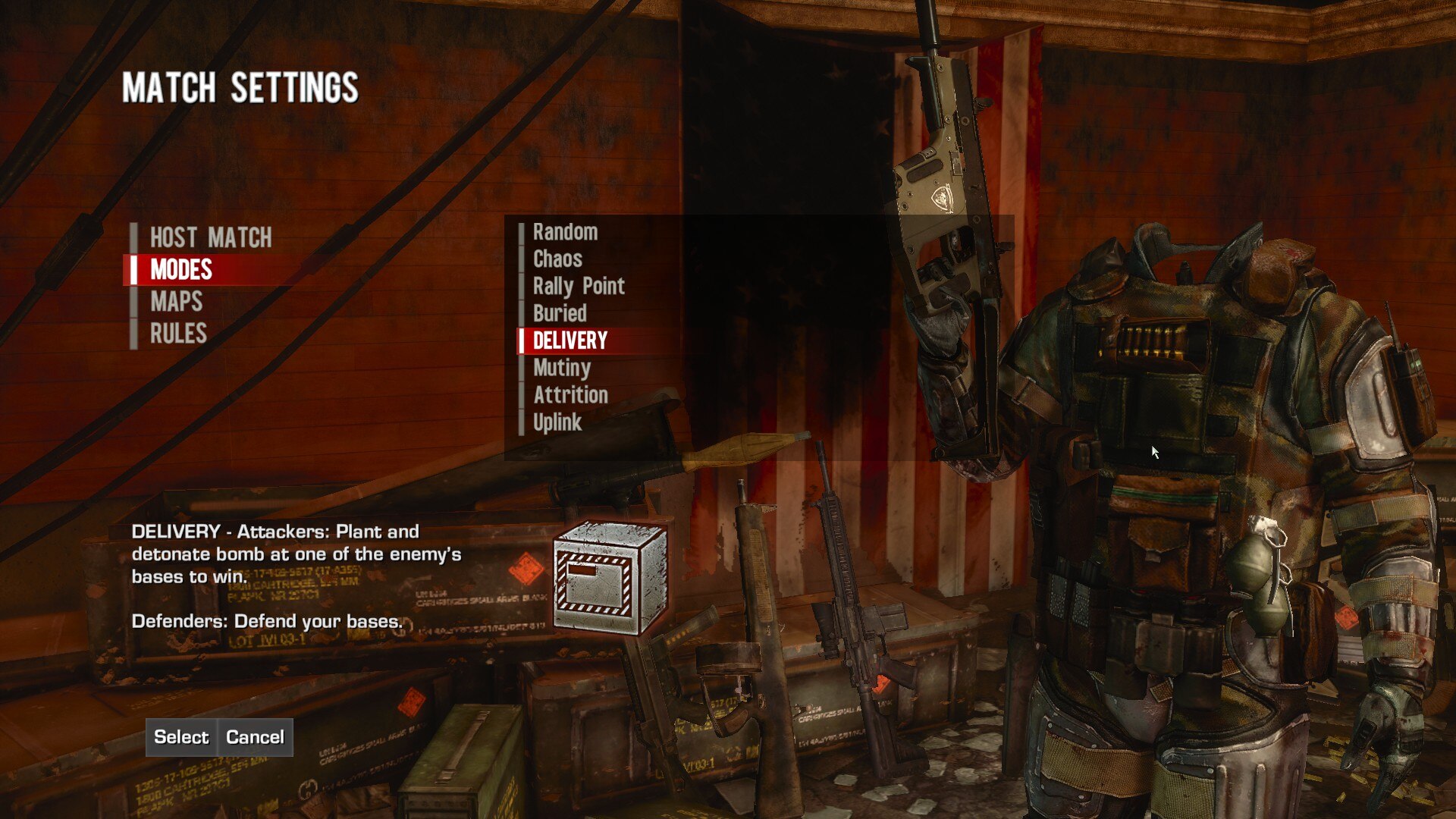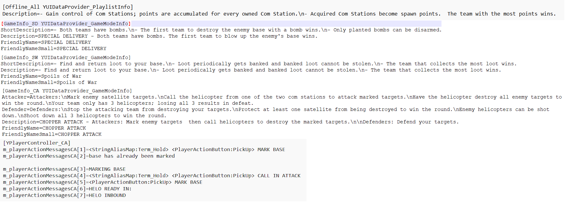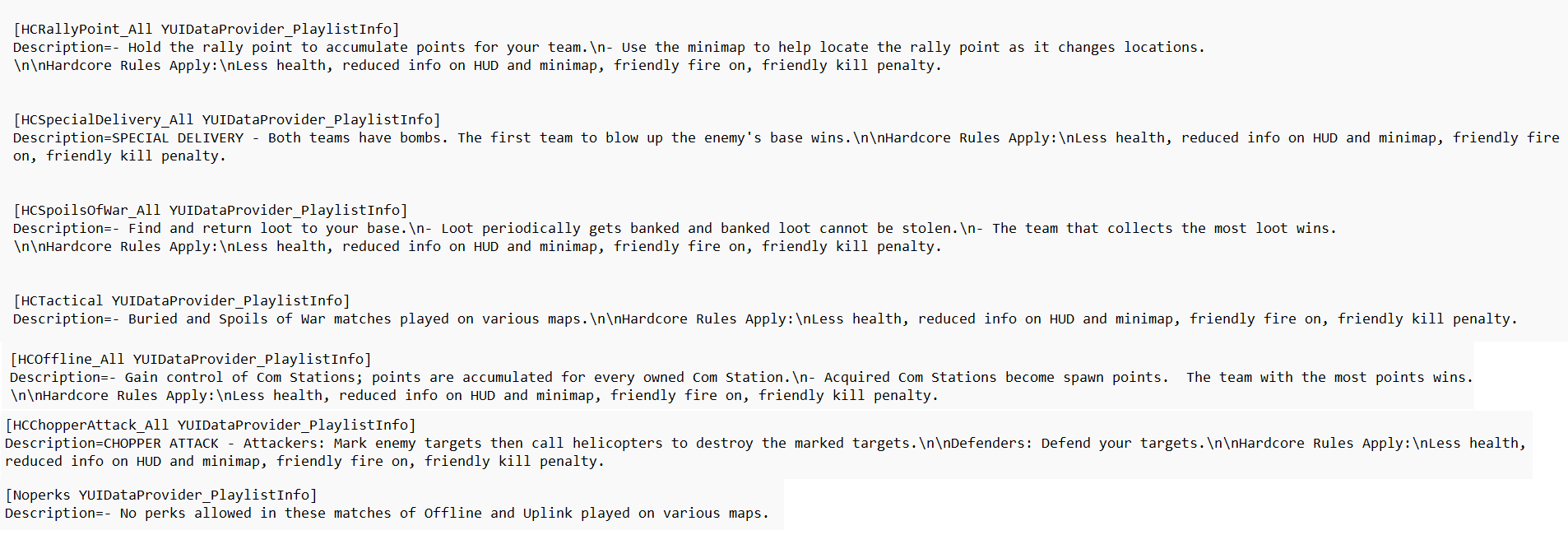 There are several cut multiplayer modes referenced in the game files, some of which got far enough along to have their own .upk files in the final game! Their descriptions remain in the localization files, so we can know for sure what they were about. They are called Spoils of War, Offline, Chopper Attack, and Special Delivery. Modified versions of the modes would have been available as NoPerks and Hardcore.