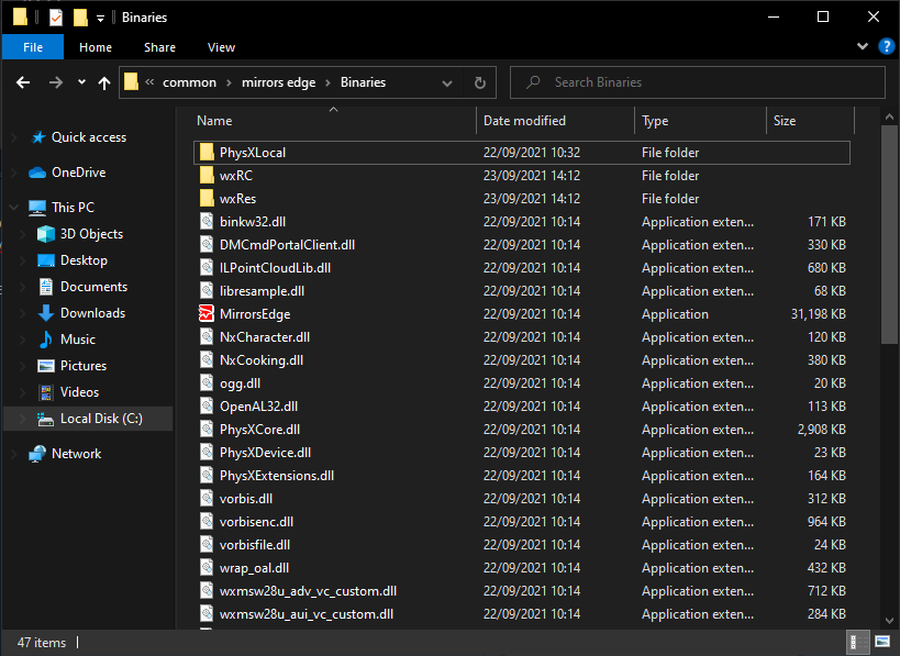 Specifically, we're looking for the folders wxRC and wxRes. With these two folders acquired, head to your Mirror's Edge game directory. For me, and probably you, too, it's located in C:\Program Files (x86)\Steam\steamapps\common\mirrors edge\ then head into the Binaries folder.