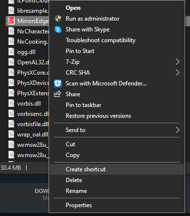 With the required files placed in the binaries folder, we now need to create a shortcut to the MirrorsEdge.exe file. We create a shortcut since that allows us to add some launch parameters that tell Mirror's Edge to launch the editor. Right click on the MirrorsEdge.exe and press 'Create Shortcut' as shown below.