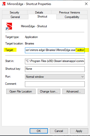 Then, you can move this shortcut to wherever you want. Personally, I place it on the desktop, and I rename it to Mirror's Edge editor. But, you can keep it in the Binaries folder if you like.