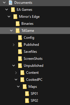 Inside the 'Maps' folder, create another folder named 'SP01'. You'll need to always save your map as 'Edge_p.me1', and NOT as a umap file. Mirror's Edge ONLY READS .me1 files.