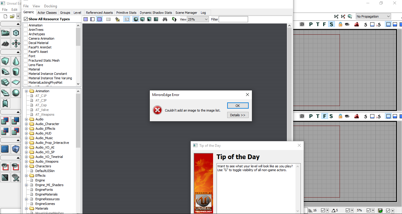 When you first launch the editor, you'll see three windows. One, an error, two, a Tip of the Day, and three, a content browser.