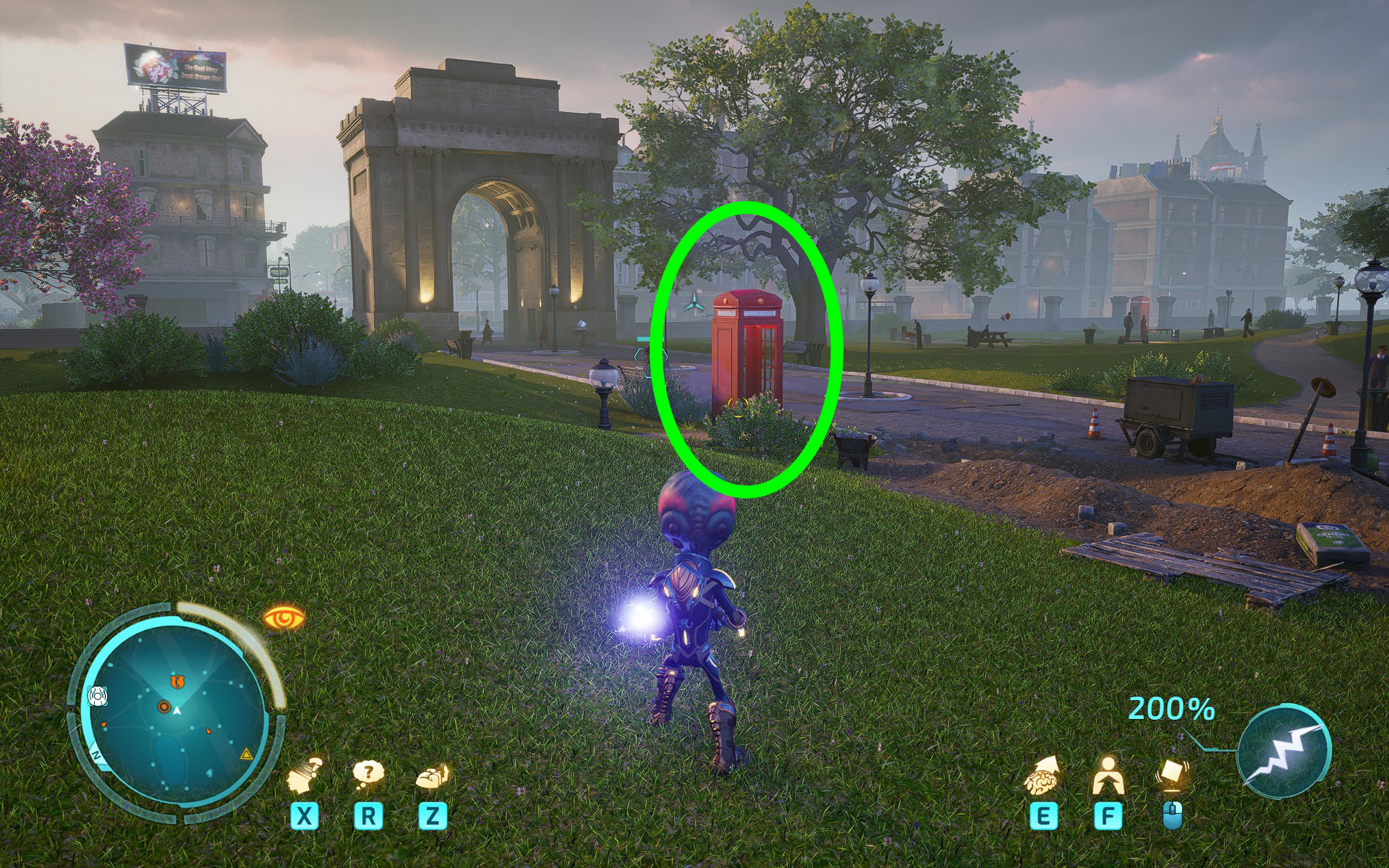 To destroy the spores, you'll have to contend with hordes of humans shooting at you as well as the spores themselves. I found this to be easier by luring the humans away from the spore containers, killing them, and then killing the spores. If the spores mutate into a human, you'll have to use your anal probe. It's a bit chaotic, so it's okay to run away to let your shield charge up.