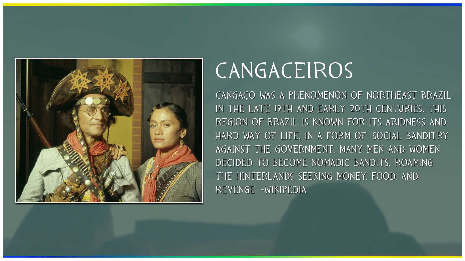 Cangaceiros were a group of outlaws that roamed the Northeastern region of Brazil in the late 19th and early 20th centuries. They were known for their distinctive clothing and weapons, including leather hats, bandanas, and rifles. They were often associated with social and economic struggles, as they targeted wealthy landowners and government officials who they believed were exploiting the poor.