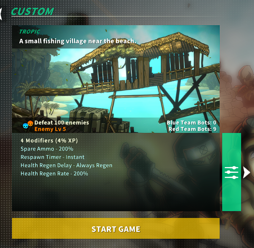 It can sometimes take ten or twenty seconds before an enemy comes near, so to increase the frequency I set up a custom deathmatch game, solo vs. nine enemies, with a goal of 100 kills. To aid survivability, I recommend increasing spare ammo and health regen. I set the respawn timer to 0 to stay in the flow easier and to get more enemy encounters.
