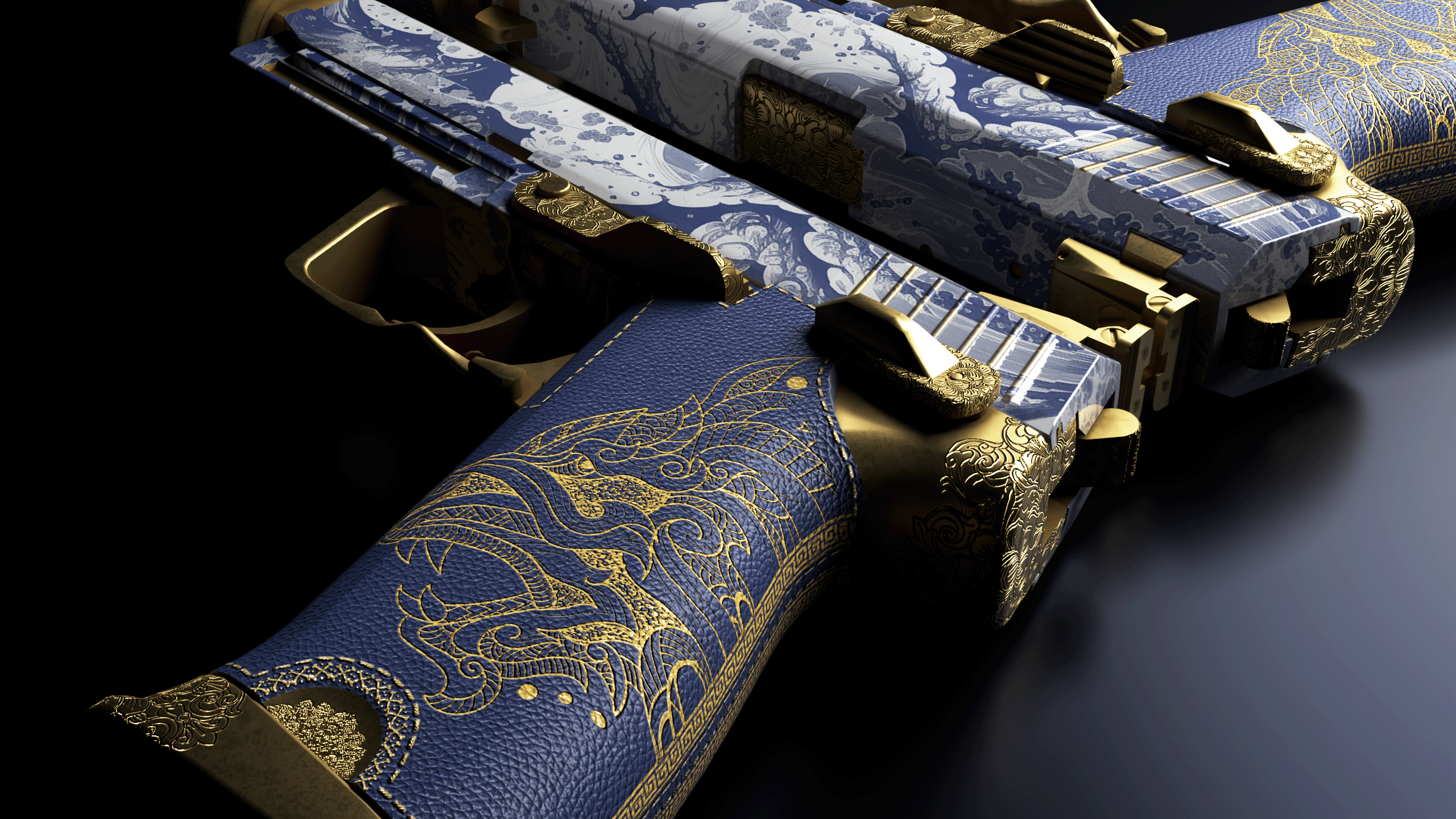 Usp-S Kanji blue leather, golden stitches & engravings and gold metal finishes.
