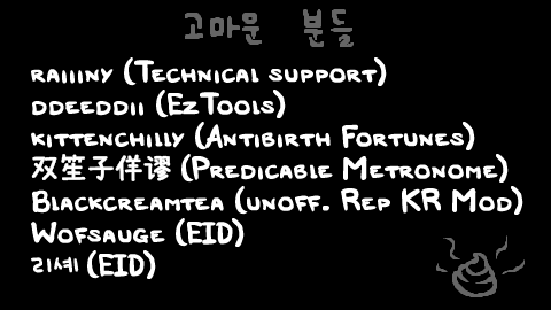 아래 방법은 REPENTOGON+[gall.dcinside.com]사용자를 위한 안내입니다. 바닐라에 한글패치가 설치돼있다면 게임 파일 무결성 검사를 통해 한글패치를 제거하고 RGON+을 설치/업데이트해야 합니다. (한글패치가 설치돼있다면 RGON+ 런처는 업데이트를 받지 않습니다.)