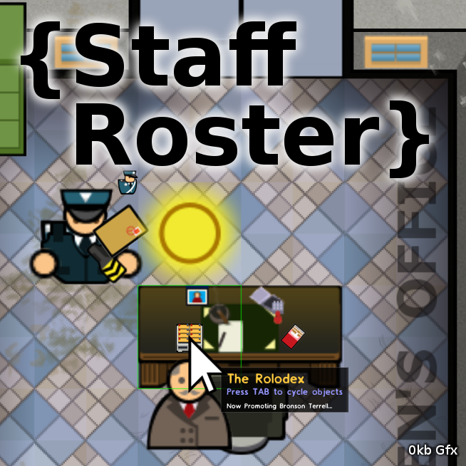 This fun mod adds a new item to the menu: The 'Rolodex'; Place it on the Warden/Chiefs desk, from there on it sets gender specific (randomized) names, titles and suffixes to all staff members, including but not limited to Dogs! Generates over 2 million combinations!