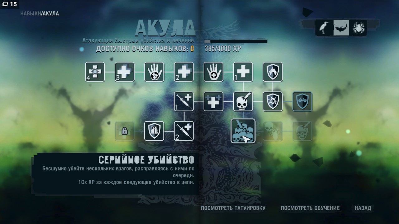 Отдельно хочется поговорить про прокачку персонажа. Проходя миссии и подымая свой уровень, вы получаете очки опыта, которые можно потратить в трех различных ветках умений. Вам открыты все дороги. Вы можете слепить кровожадного монстра, или тихого убийцу. Но интересней экспериментировать и смешивать ветки умений. Прокаченные навыки, отображаются в виде татуировки на левой руке Джейсона. Выглядит интересно и красиво.